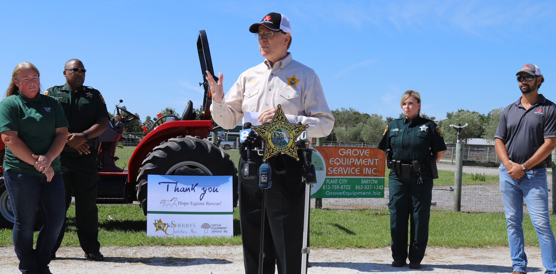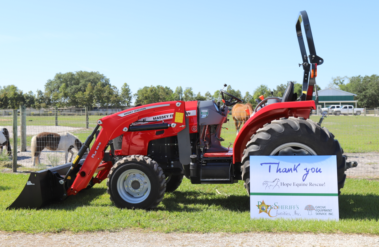 Sheriff Grady Judd presented a new Massey Fergusson MF2760E tractor to Hope Equine Rescue (HER) of Winter Haven on Tuesday, May 12, 2020. Polk Sheriff's Charities, Inc., donated $18,500 toward the purchase of the tractor for the non-profit rescue which cares and places unwanted, abused, and neglected horses and donkeys.